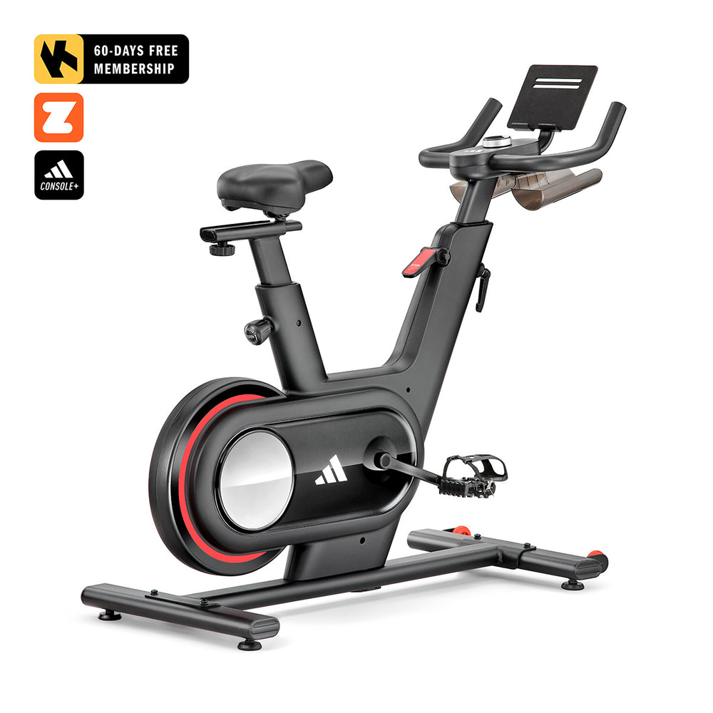 Open a world of fitness opportunities with the adidas C-1 sprint bike indoor cycle. Enjoy ultra-smooth, quiet action, a natural riding feel and road-realistic intensity thanks to the fixed 8kg (18lbs) Performance Flywheel and 32 digital resistance levels. With Bluetooth and an adjustable tablet holder, the bike offers smart connectivity for truly immersive interactive workouts. Set out on a personalised fitness journey and get access to virtual routes, video game style workouts, live coaching and detailed performance tracking with the compatible Zwift, Kinomap (60-day Free trial included) and adidas Console+ apps. Make swift adjustments with the machine’s intuitive rotating dial interface and discover motivating challenges choosing from 12 onboard workouts. Ride longer and maximise results thanks to the bike’s comfort features including dual-adjustable padded saddle, multi-grip handlebars, built-in water bottle holders and self-levelling pedals with adjustable straps ensuring locked-in performance.