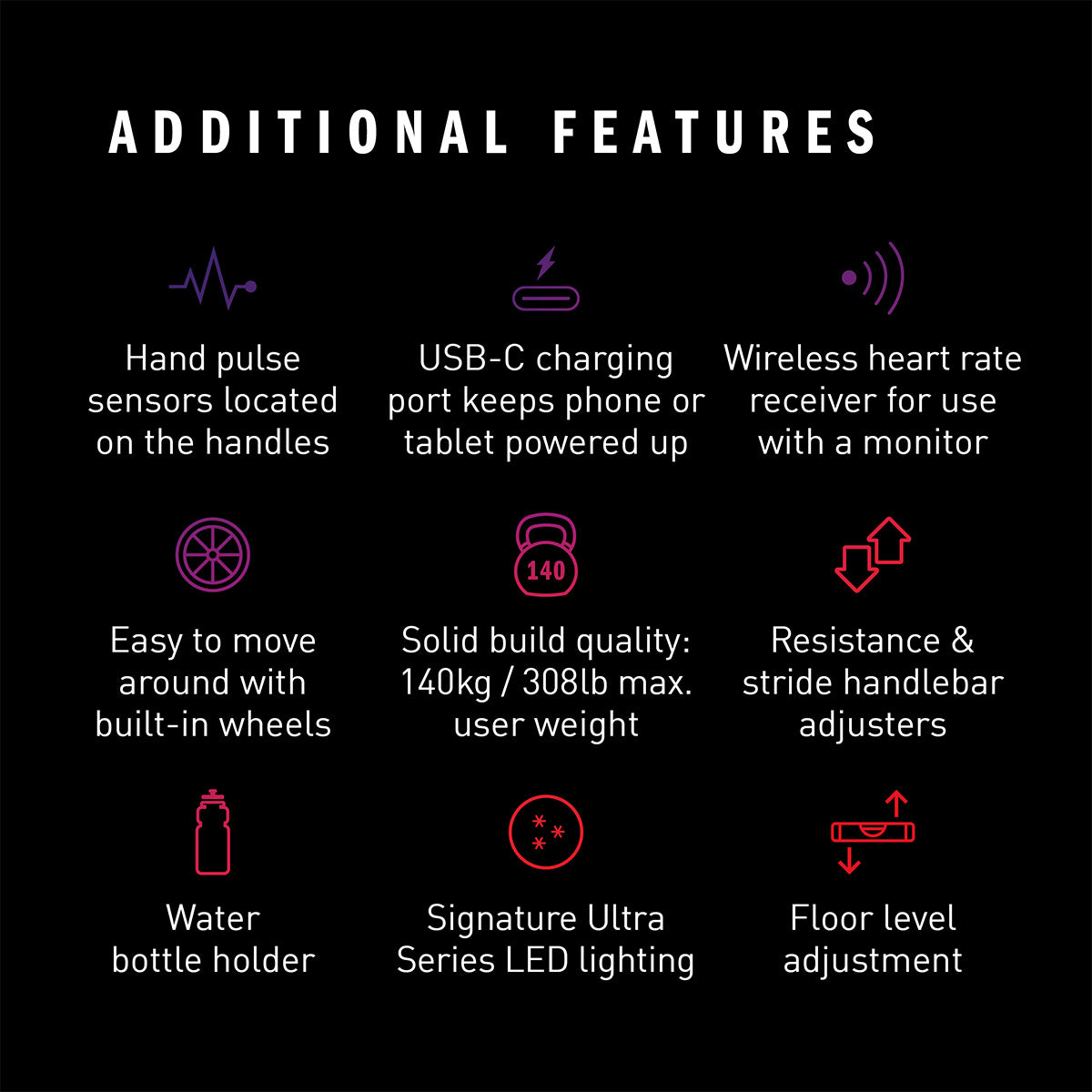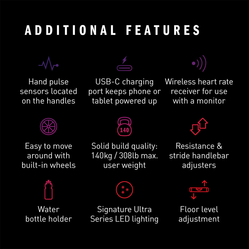 - Additional Features: Water bottle holder, levelling feet, USB-C charging port, Bluetooth dongle; Ultra series red LED lighting