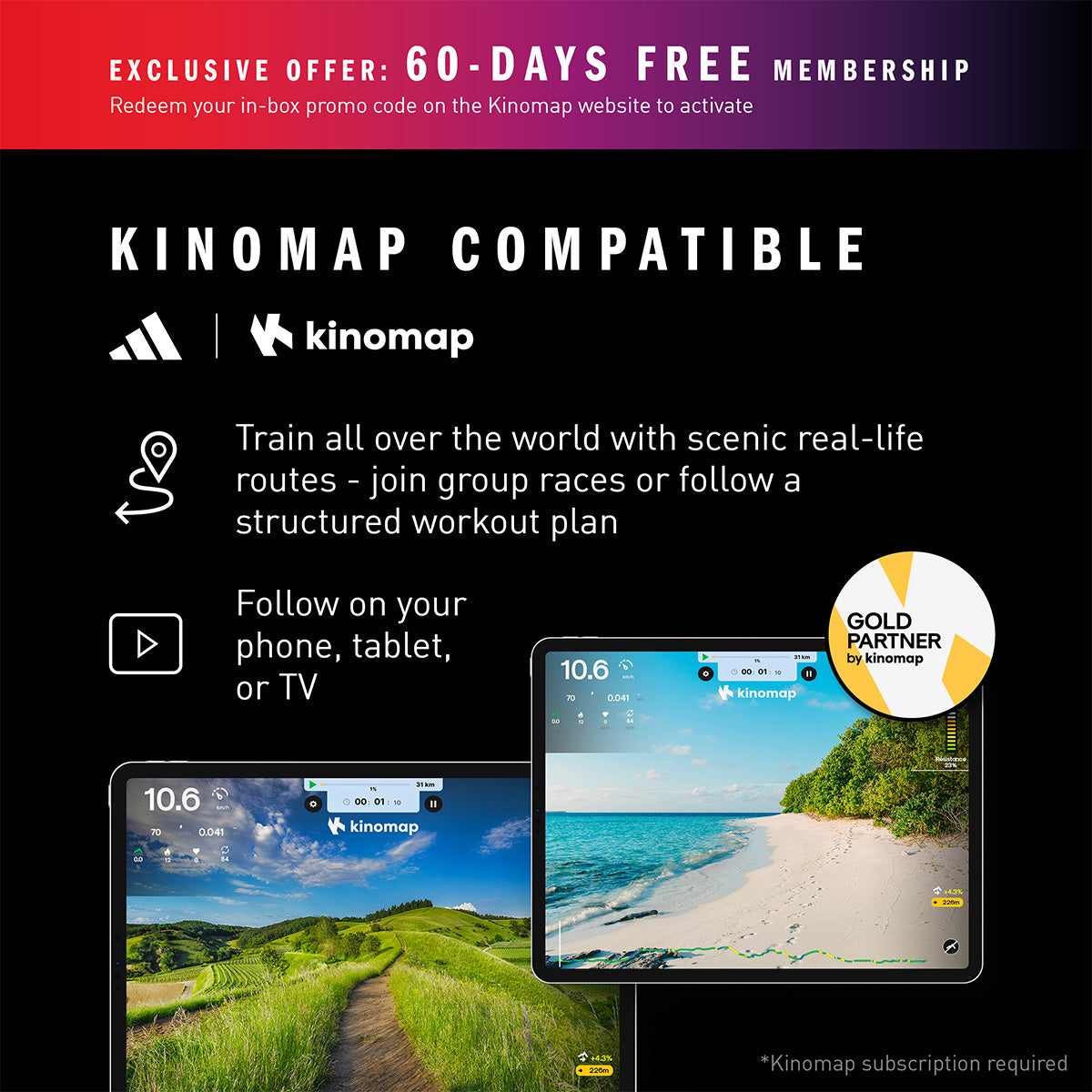 - Compatible Applications: Kinomap (60-day Free Kinomap trial included), adidas Console+