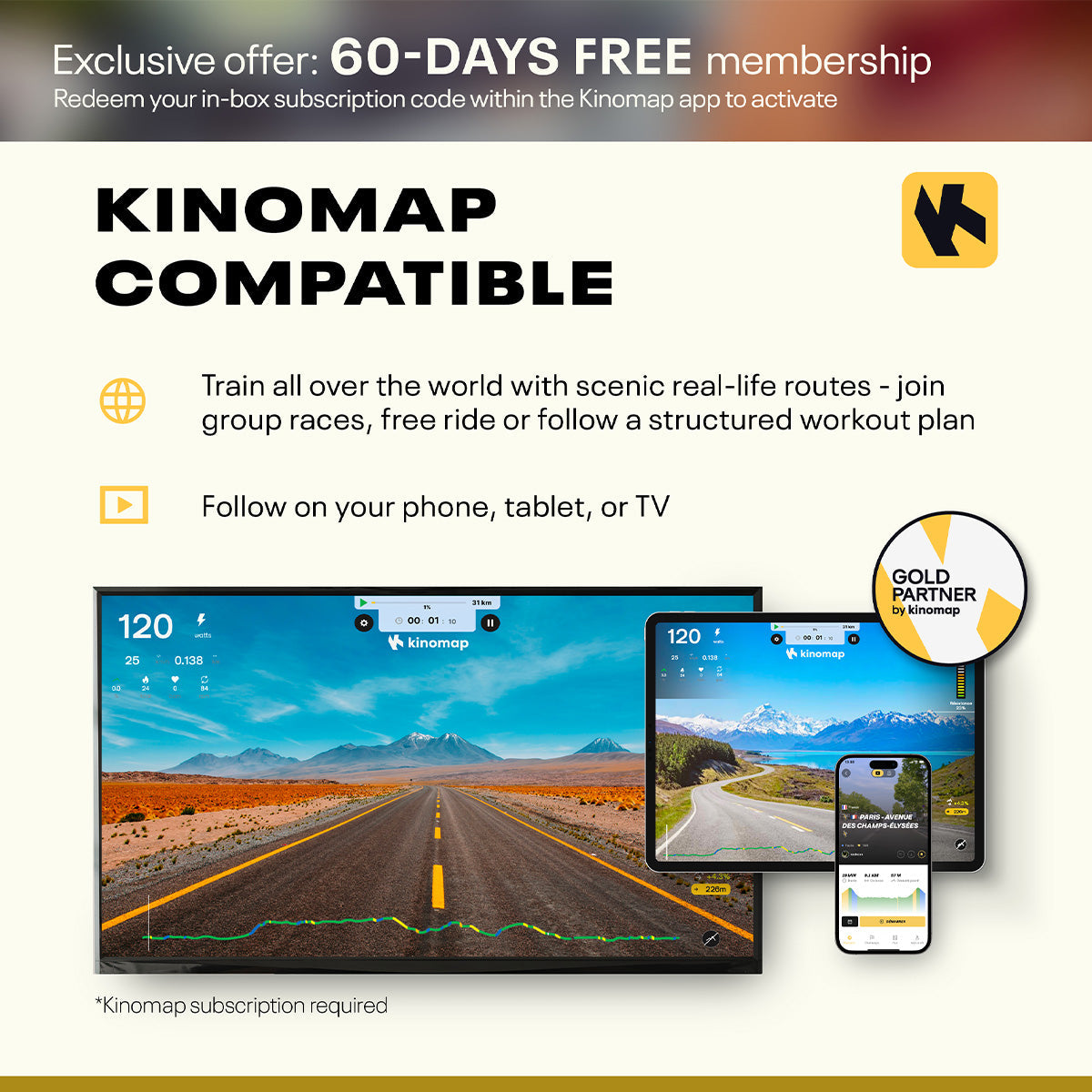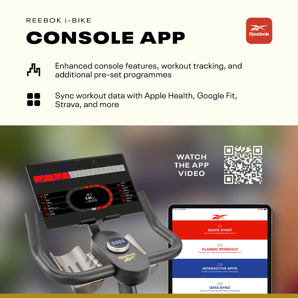 - Compatible Applications: Zwift, Kinomap (60-day Free Kinomap trial included), Reebok Console