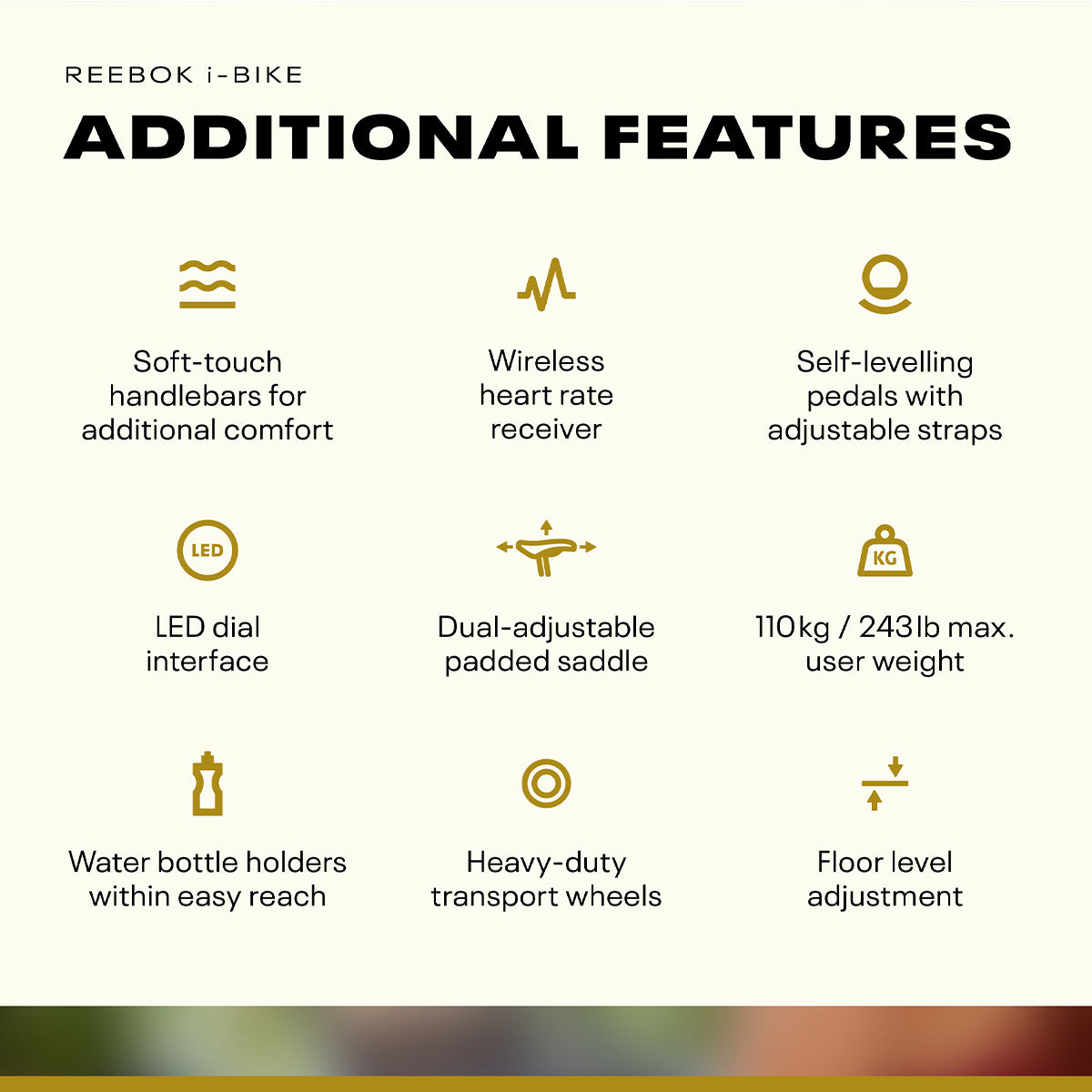 - Flywheel Weight: 8kg (18lbs); fixed Reebok Flow flywheel