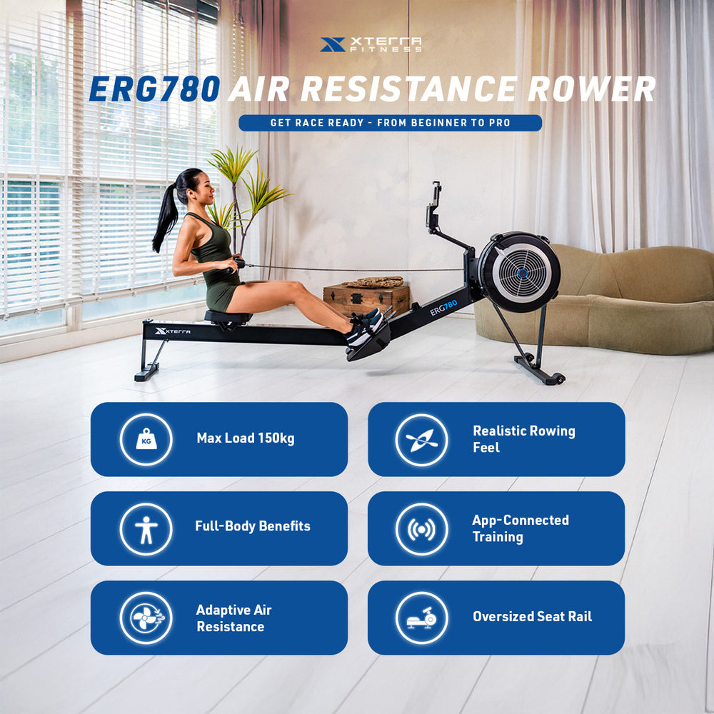 The NEW 2026 Xterra Fitness ERG780 is a high-performance air rowing machine designed to deliver a realistic rowing experience and a full-body workout that engages over 80% of major muscle groups. With 10 levels of dynamic, manually adjustable air resistance, it not only responds to stroke intensity offering natural progression but also provides smooth rowing motion and an authentic, on-water rowing feel. Featuring Bluetooth connectivity, the rower ensures a plethora of smart training options with the compatible XF Connect and Kinomap apps to let you discover thousands of on-demand workouts, follow scenic routes, structured workouts and track progress in real time. Monitor crucial workout data on a user-friendly, adjustable console with a clear LCD display ensuring a perfect viewing angle. Enjoy ergonomic comfort for longer sessions thanks to a large, padded seat, a non-slip handle and adjustable footplates designed to minimise strain and improve rowing posture. Once you’re done with your workout, fold the ERG780 up to save precious floor space in your home gym thanks to its foldable frame offering a vertical storage position.